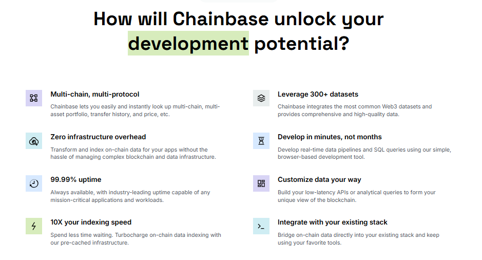 Chainbase는 웹3 데이터 인프라를 제공하는 탈중앙화 플랫폼입니다. 이 플랫폼은 다양한 온체인 데이터를 효율적으로 수집, 저장 및 분석하여 블록체인 개발자와 사용자에게 필요한 데이터 서비스를 제공하는 것을 목표로 합니다. 이는 블록체인 생태계 내 데이터 접근성과 활용성을 증진시키는 데 기여합니다.