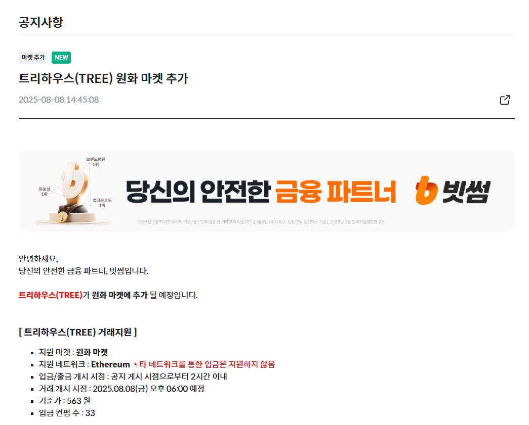 - 빗썸 상장: TREE 코인이 2025년 8월 8일 18:00에 빗썸 원화 마켓에 상장됩니다. 입금은 16:45부터 가능해요.