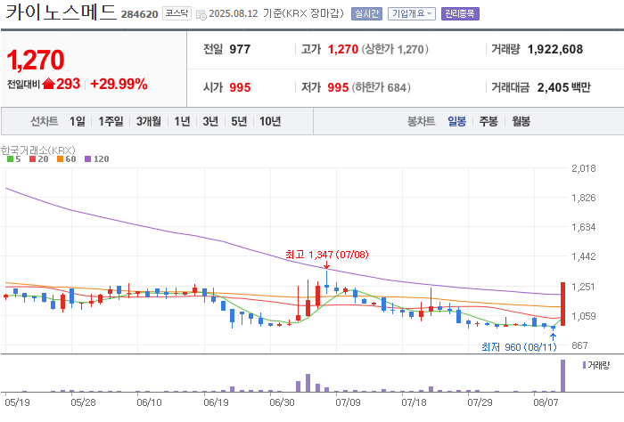 2025년 8월 12일 오전, 카이노스메드의 주가는 장중 29.99% 상승하며 상한가에 진입했습니다. 전일 종가 977원에서 약 1,270원으로 거래되며 높은 상승률을 보였습니다. 최근 한 달간 주가수익률은 업종 평균(10.01%)을 크게 상회하는 약 26.87% 상승을 기록했습니다.