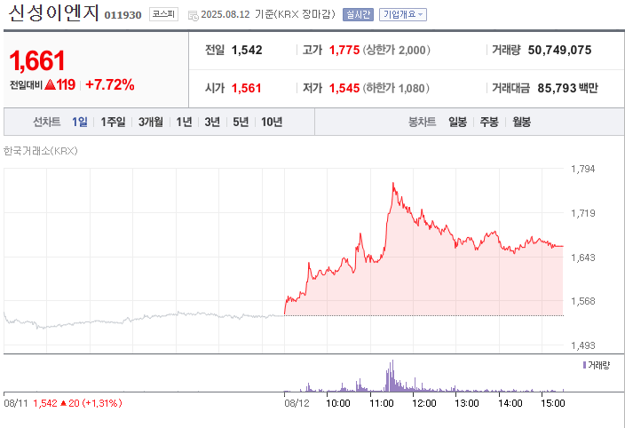 신성이엔지의 주가는 8월 12일 장중 5.9% 상승하는 등 최근 견조한 흐름을 보였습니다. 주가 상승을 이끈 주요 원인은 다음과 같습니다.