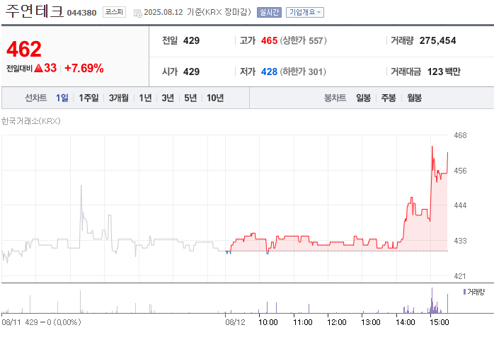 주연테크의 주가는 2025년 8월 초부터 약 7~8%의 상승률을 기록하며 긍정적인 흐름을 보였습니다. 이러한 주가 상승은 원가 상승으로 인한 영업손실 확대라는 악재 속에서도 시장의 기대감이 반영된 결과입니다. 주요 상승 요인은 다음과 같습니다.