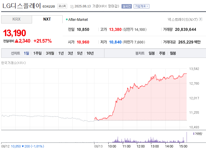 2025년 8월 13일, LG디스플레이 주가는 전일 대비 20% 이상 급등하며 시장의 뜨거운 관심을 받았습니다. 이러한 상승세의 주요 원인은 내부적인 사업 혁신과 외부 환경의 긍정적인 변화가 맞물린 결과입니다.