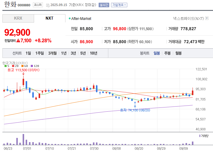 대한민국 재계를 대표하는 **한화그룹의 지주사 격 기업 한화(000880)**는 방산, 금융, 에너지, 화학 등 다양한 사업 포트폴리오를 갖추고 있습니다. 최근에는 방산과 우주산업, 친환경 에너지 부문에서 글로벌 경쟁력을 확대하며 투자자들의 관심을 끌고 있죠.