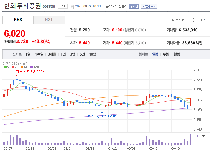 한화투자증권(003530)은 60년 이상의 업력을 가진 한화그룹 금융 계열사로, 국내외에서 종합금융투자 서비스를 제공하는 대표 증권사입니다.