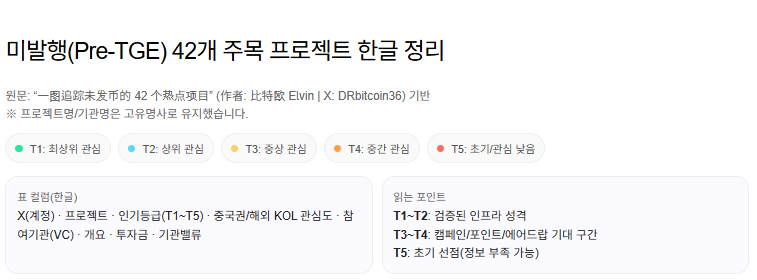 미발행(Pre-TGE) 42개 주목 프로젝트 한글 정리